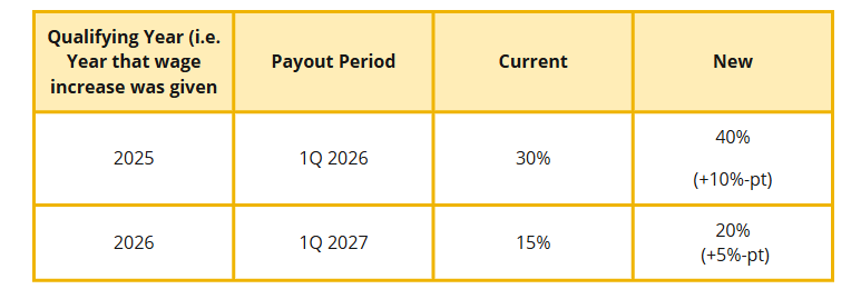 Introduced in Budget 2022, the PWCS supports wage increases for lower-income workers until CY 2026. Eligible employees must have an average gross monthly wage of up to $3,000 before the increase, and up to $4,000 after, with a wage increase of at least $100 in each qualifying year. Wage increases in each qualifying year are co-funded for two years if sustained.